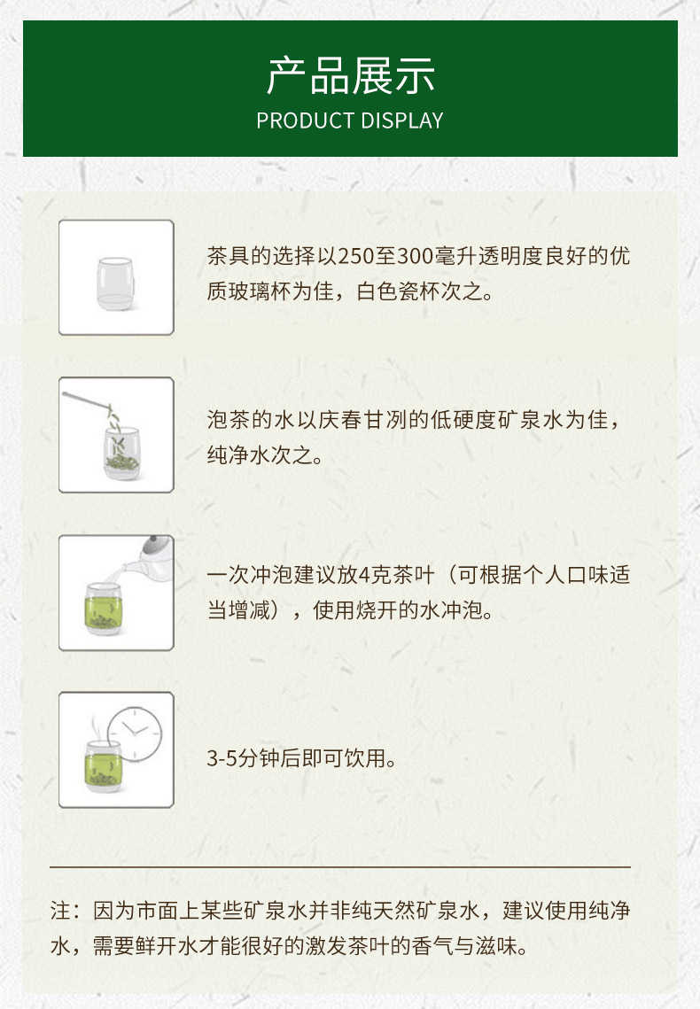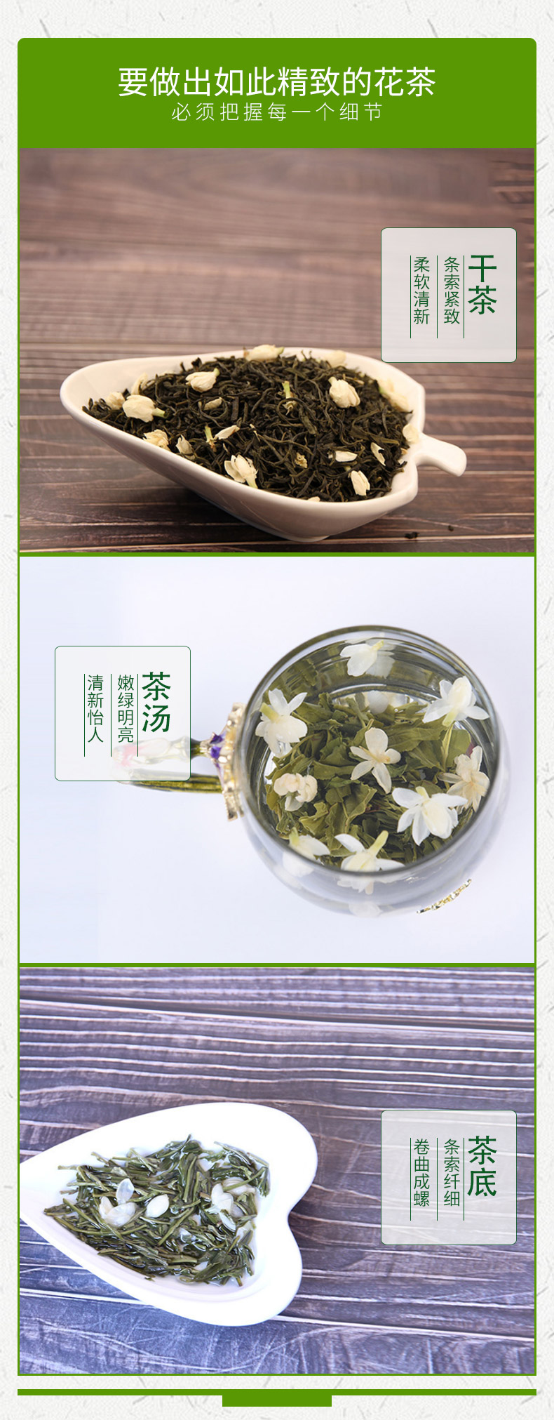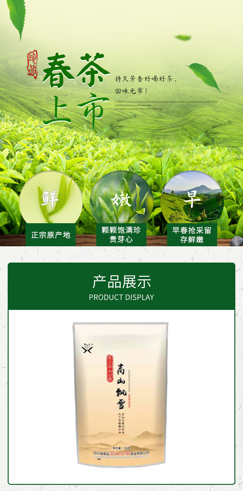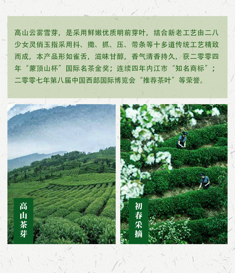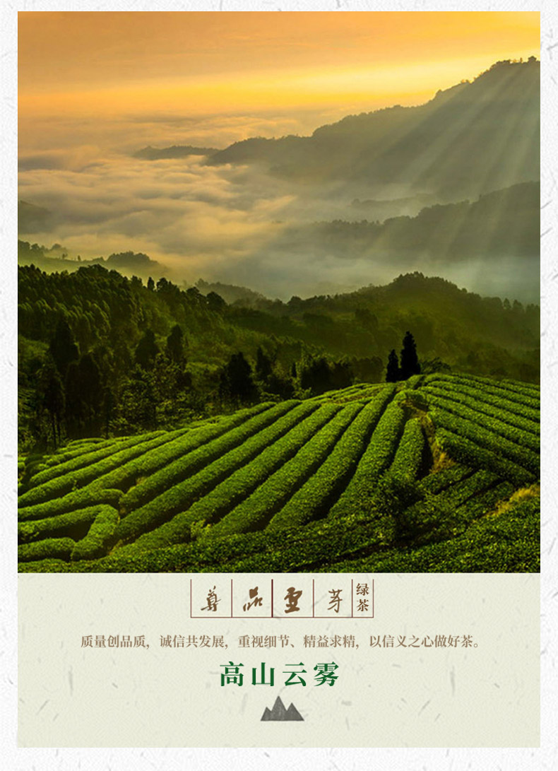 本公司生产的高山云雾特种茉莉花茶,系采用鲜嫩优质明前芽叶,结合新老工艺精工制作而成。本产品形态优美,滋味甘醇,香气清香持久,是纯天然的健康饮品。