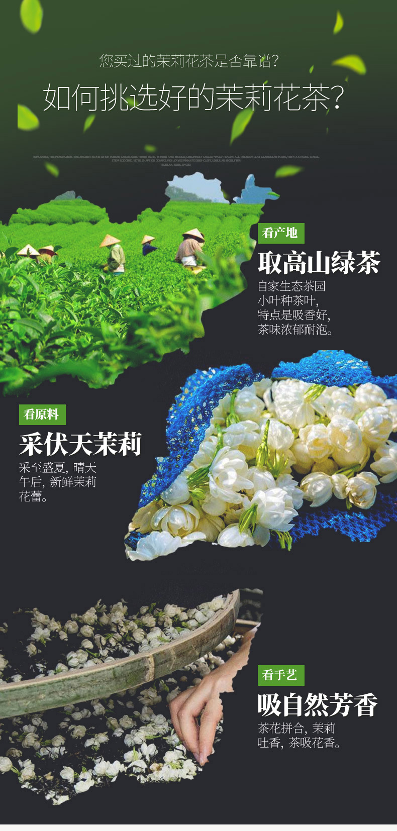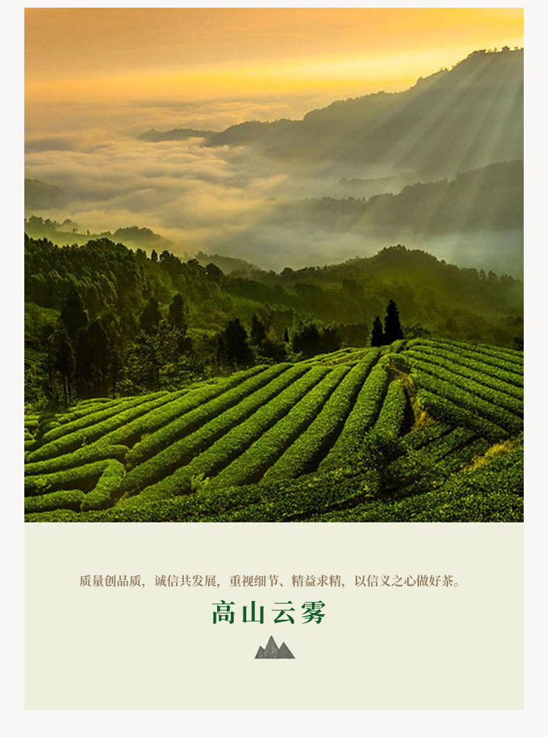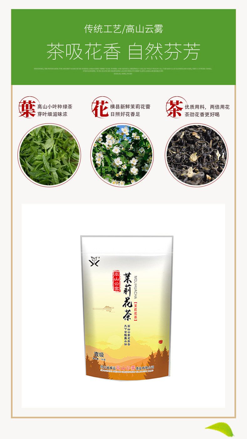 本公司生产的高山云雾特种茉莉花茶,系采用鲜嫩优质明前芽叶,结合新老工艺精工制作而成。本产品形态优美,滋味甘醇,香气清香持久,是纯天然的健康饮品。