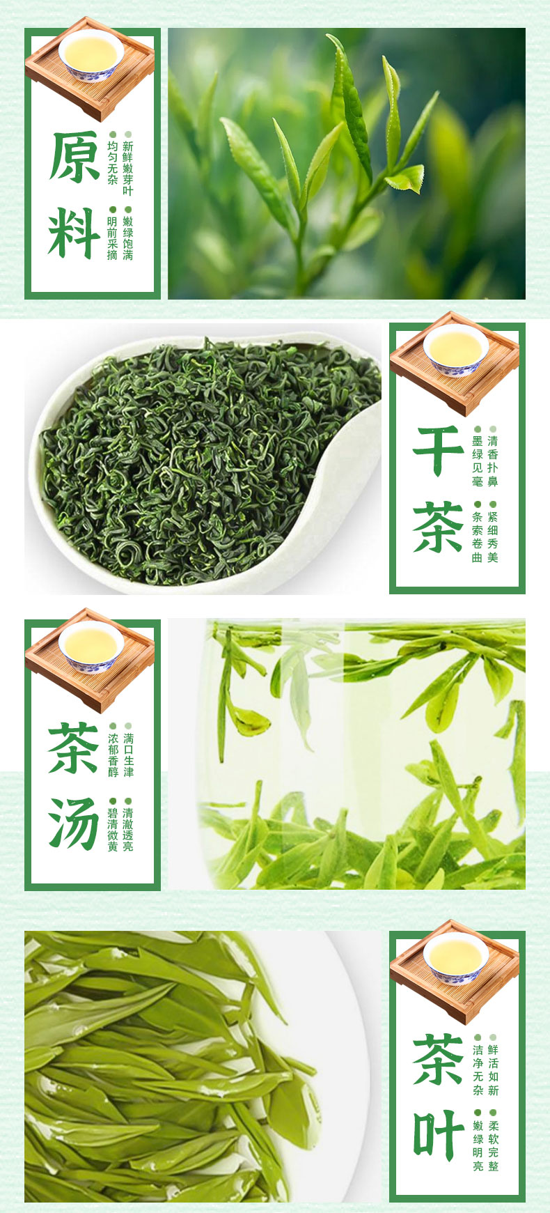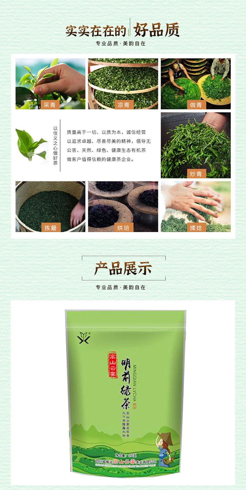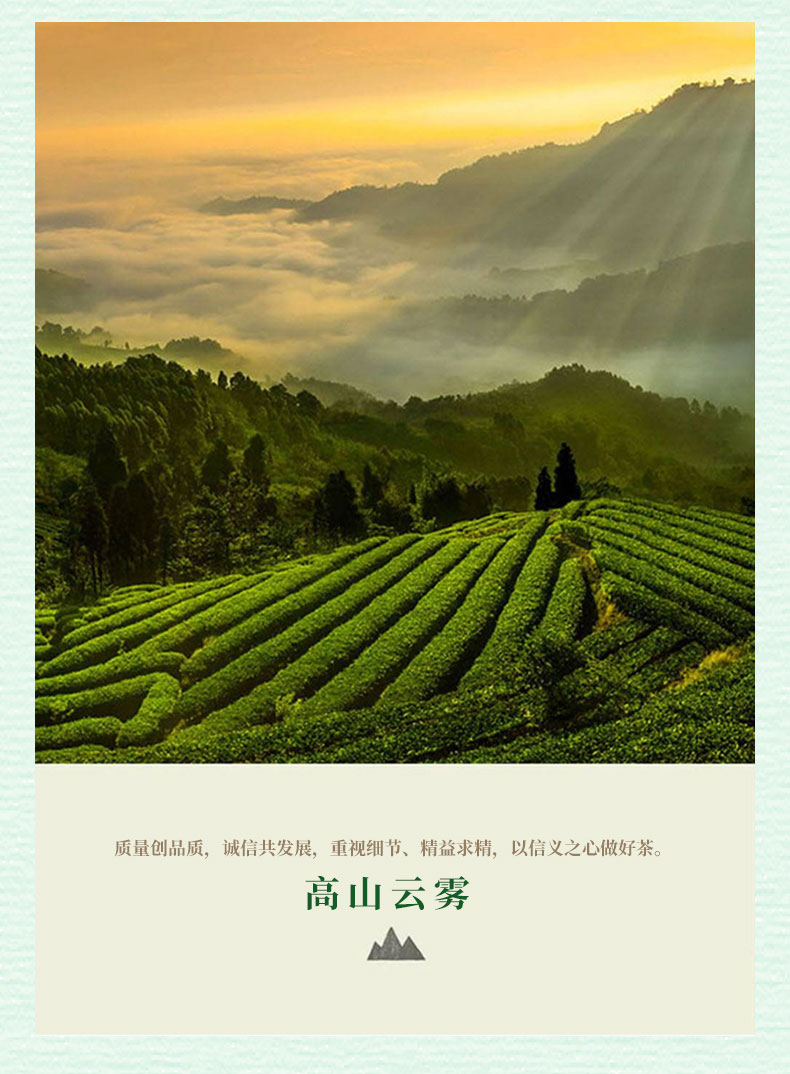 本公司生产的高山云雾明前绿茶,系采用鲜嫩优质明前芽叶,结合新老工艺精工制作而成。本产品形态优美,滋味甘醇,香气清香持久,是纯天然的健康饮品。